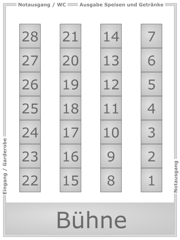 Bitte wählen Sie zunächst die gewünschte Aufführung, dann die gewünschten Plätze aus. Anschließend geben Sie bitte Ihre Reservierungsdaten ein. Folgende Symbole werden hierzu verwendet: